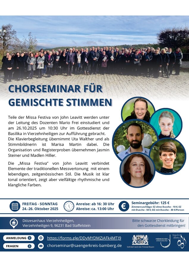 | 24.10. - 26.10.2025 Anmeldeschluss: 17.10.2025 | Gemischtes Chorseminar | Mario Frei | Diözesanhaus Vierzehnheiligen Vierzehnheiligen 9 96231 Bad Staffelstein | Anmeldelink | Ausschreibung |